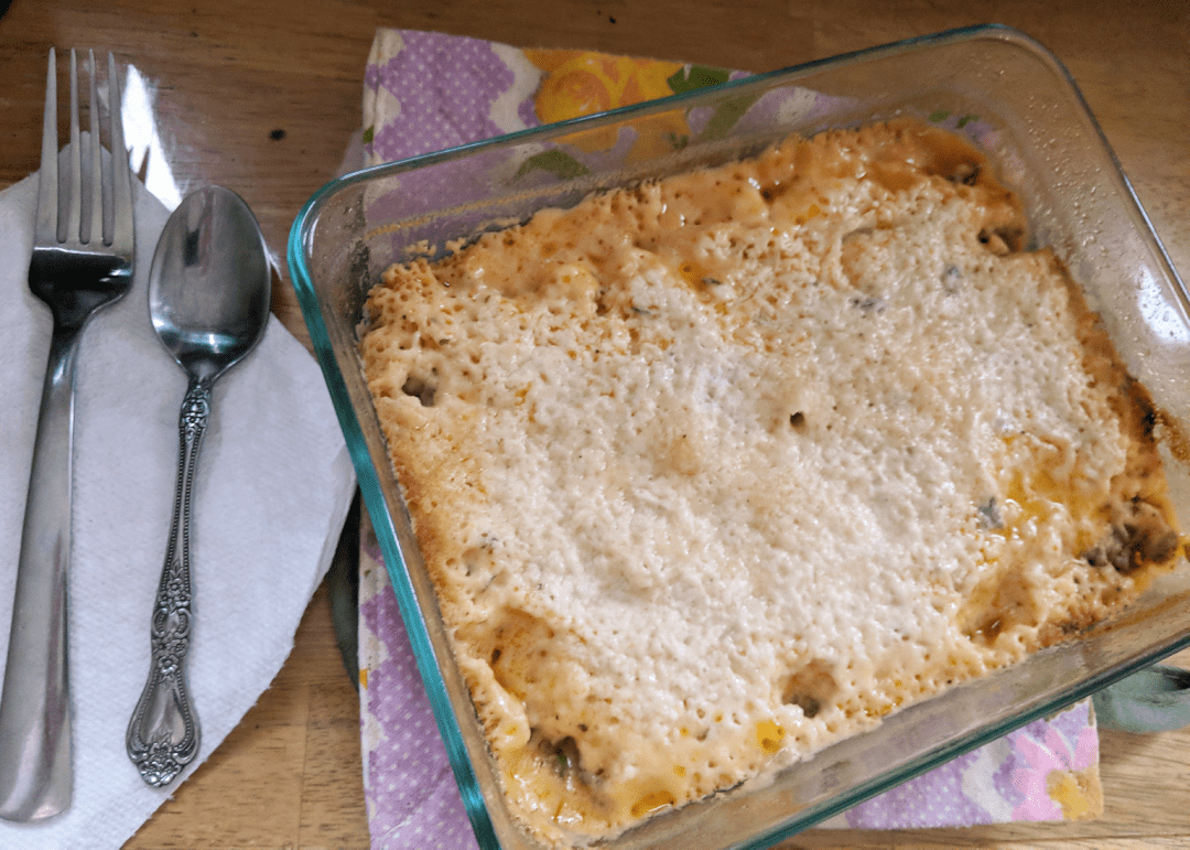 What it looks like if I add the grated Parmesan cheese and bake (or reheat in the microwave). It gets all cheesy and bubbly on top!