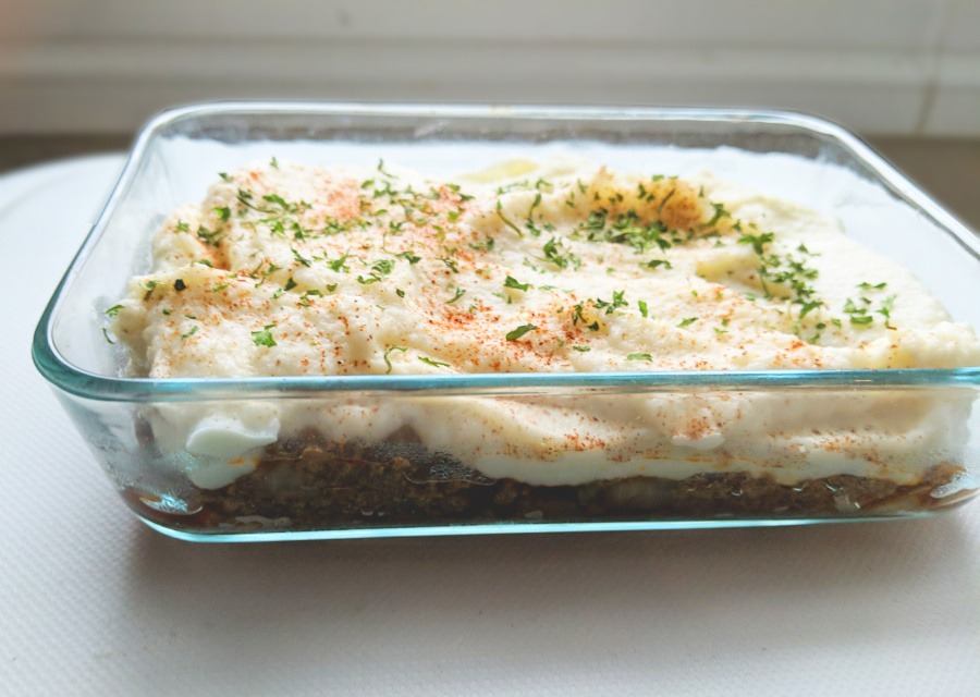 - In a pie dish or baking dish, spread out the meat mixture and top with a generous layer of the mashed veggies. If you like, garnish with a sprinkle of paprika and parsley.